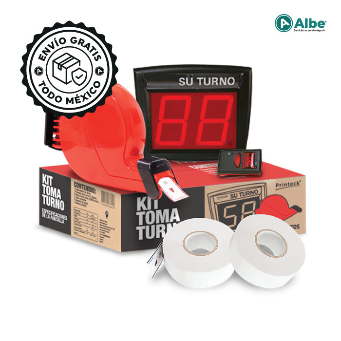 Kit con Pantalla Alámbrica Mini, Expendedor y 2 Rollos Turno. Color Negro. 2 Dígitos. Cable de 15 cm. Cada Rollo contiene 2000 Tickets.